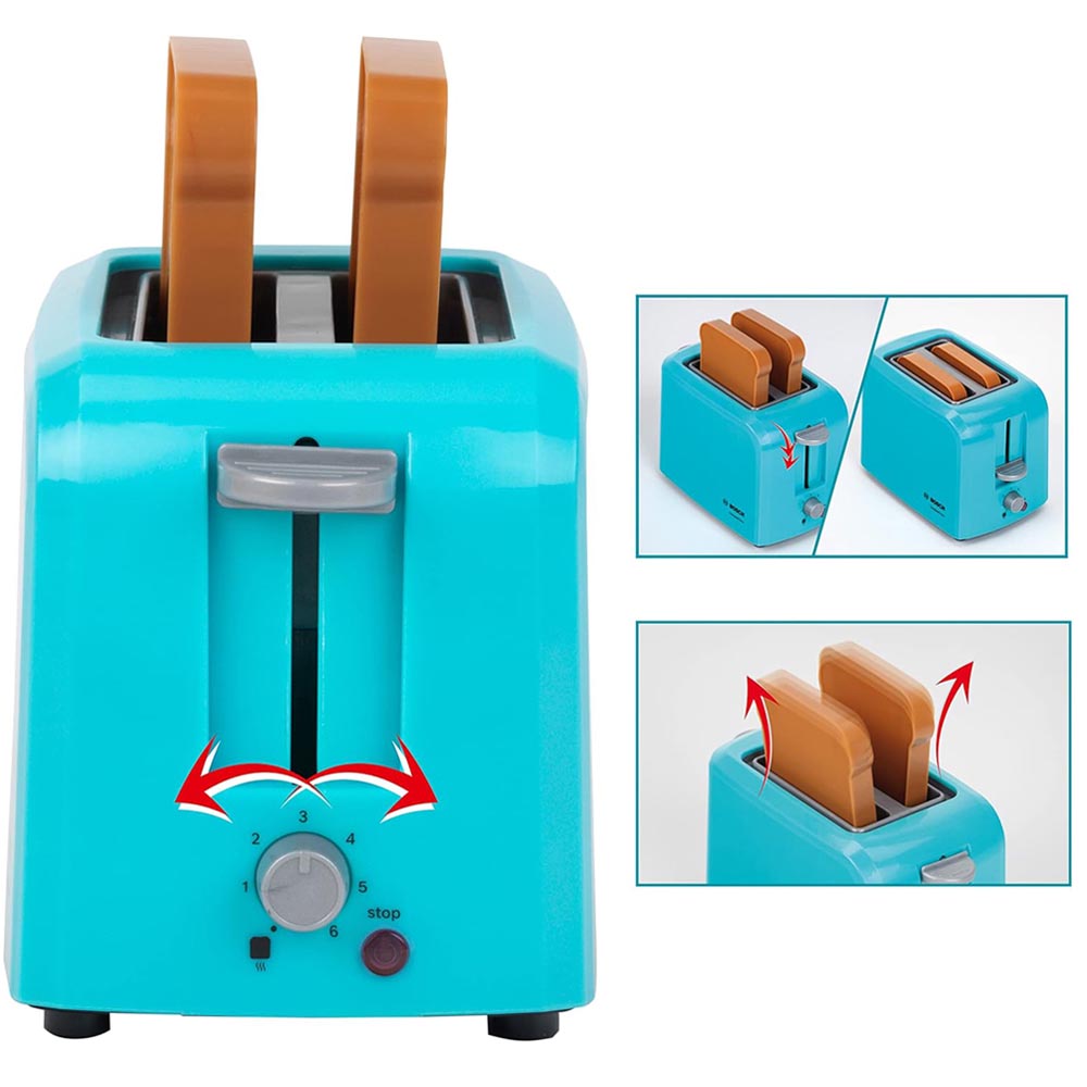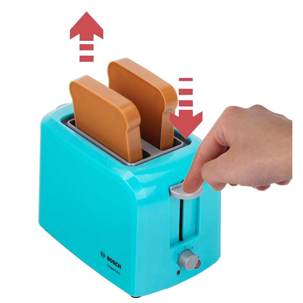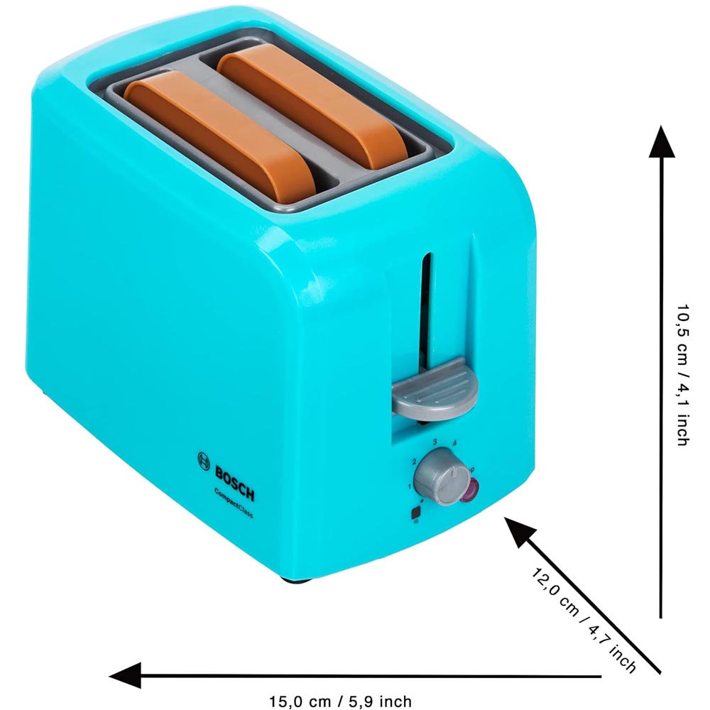 La tostadora para niños es el accesorio adecuado para cualquier cocina de juego bien equipada. Este accesorio para cocinas de juego es una réplica fiel en diseño Bosch y tiene un botón en el lateral para ajustar de forma lúdica el grado de tostado. Con un control lateral, las rebanadas de pan se pueden bajar para que salgan automáticamente cuando estén listas. Este juguete de cocina proporciona mucha diversión en el juego de roles, desarrolla la motricidad, la imaginación y las habilidades de comunicación.